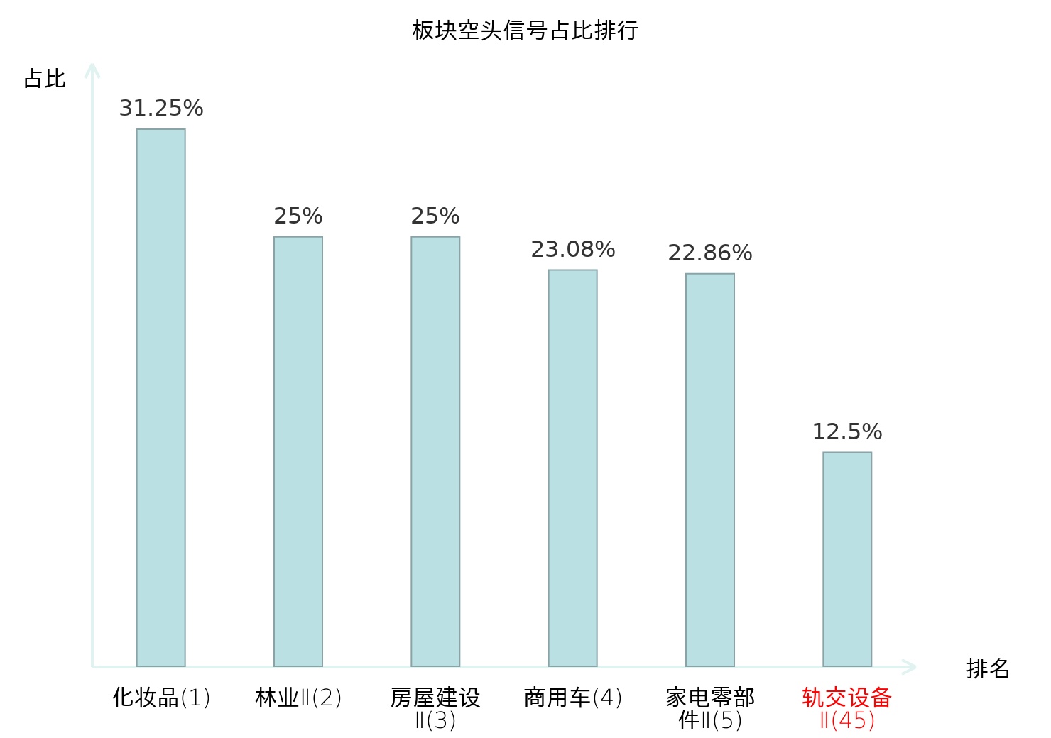 全市场所有行业板块中主力空头信号占比排名中,化妆品板块位居第一。房屋建设Ⅱ板块名次提升最快,较昨日上升113位。