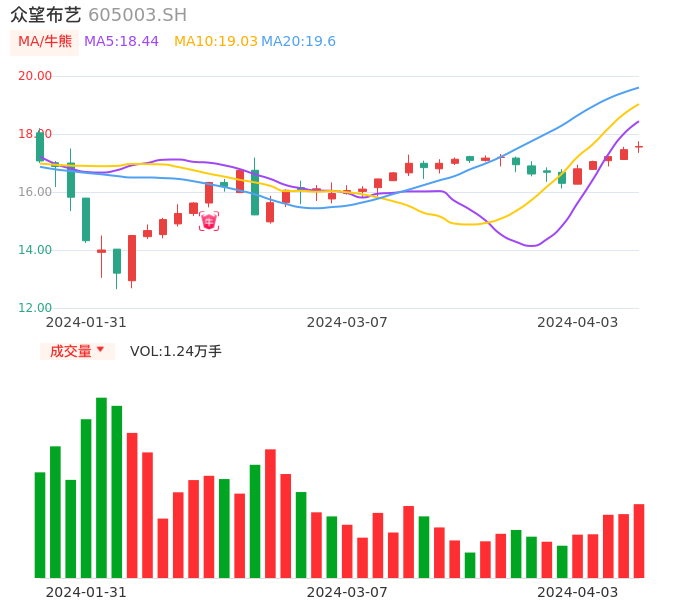 04月03日,众望布艺收报17.57,股价涨幅0.63%,成交金额2183.66万元,换手率1.13%。