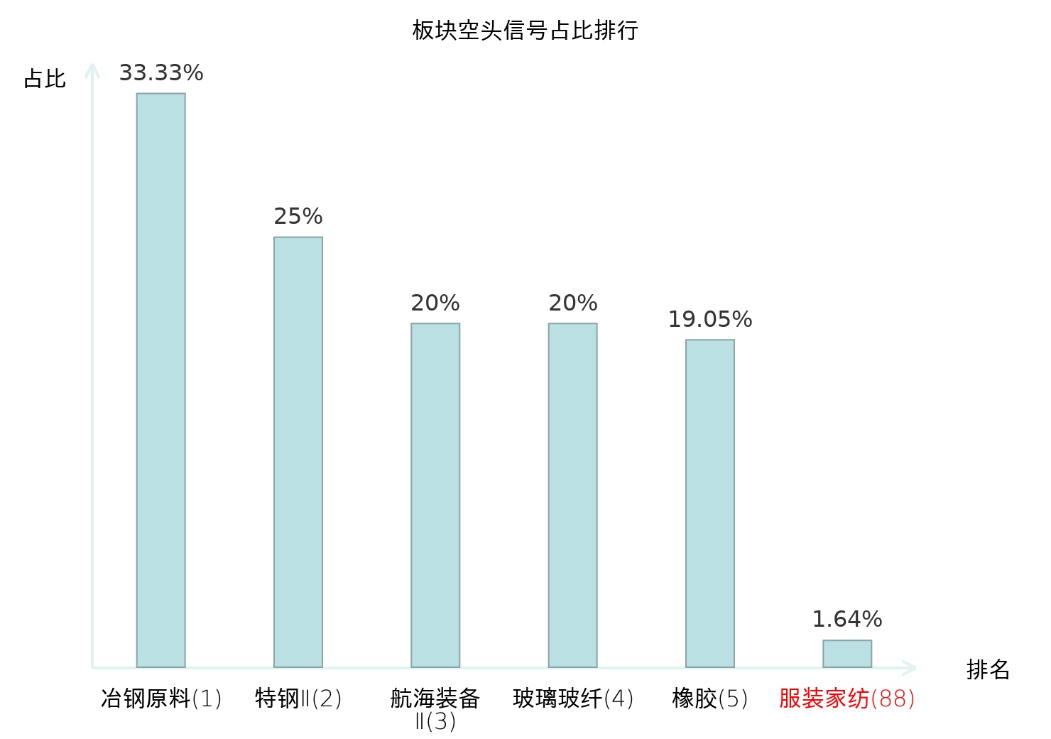全市场所有行业板块中主力空头信号占比排名中,冶钢原料板块位居第一。军工电子Ⅱ板块名次提升最快,较昨日上升98位。