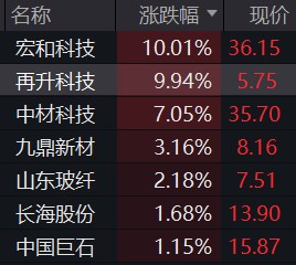 上证报中国证券网讯12月8日,A股玻璃纤维概念保持活跃,截至13时42分,宏和科技、再升科技涨停,中材科技、九鼎新材、山东玻纤、长海股份、中国巨石等个股跟涨。