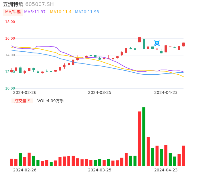 04月23日,五洲特纸收报15.49,股价涨幅2.86%,成交金额6257.51万元,换手率1.02%。