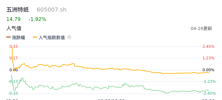 04月26日,五洲特纸收报14.79,股价涨幅-1.92%,成交金额5750.32万元,换手率0.97%。