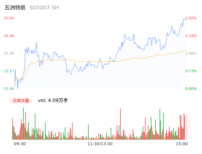 04月23日,五洲特纸收报15.49,股价涨幅2.86%,成交金额6257.51万元,换手率1.02%。