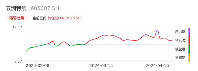 我们来看一下该股的九方特色指标强弱趋势的情况:五洲特纸自04月10日从压力区回到持仓区。股价在持仓区盘整一段时间后,目前有启稳迹象。后续重点关注上方压力位:15.50元是否能重新上攻。