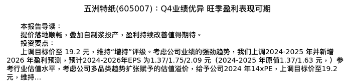 值得注意的是:2024年04月国泰君安的王佳/毛宇翔分析师,首次发布关于五洲特纸的研究报告,标题为:五洲特纸(605007):Q4业绩优异 旺季盈利表现可期。