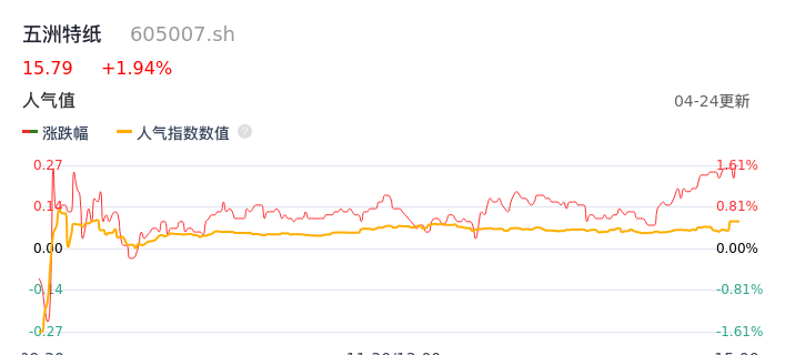 04月24日,五洲特纸收报15.79,股价涨幅1.94%,成交金额6015.29万元,换手率0.96%。