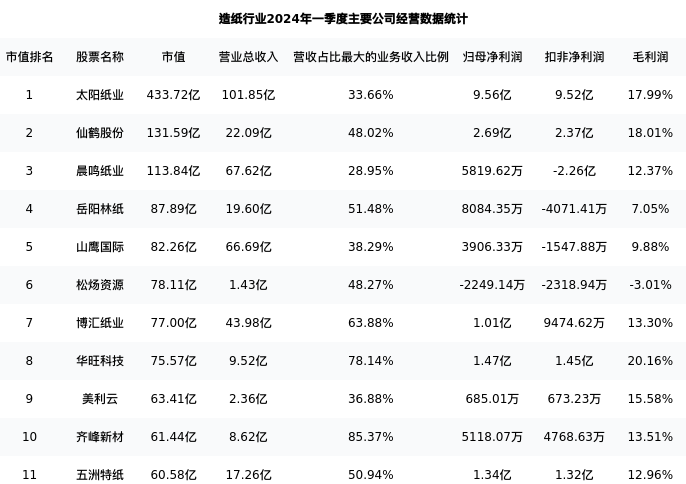 五洲特纸最新报告期数据为一季度,下表汇总了造纸行业内市值靠前的公司一季度主要经营数据