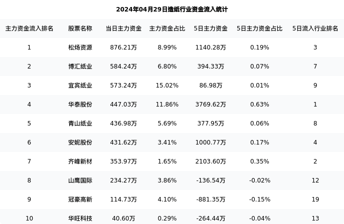 从主力资金流向来看,造纸行业今日主力资金流入6.60亿元,在所有申万二级行业中排名:22/131。