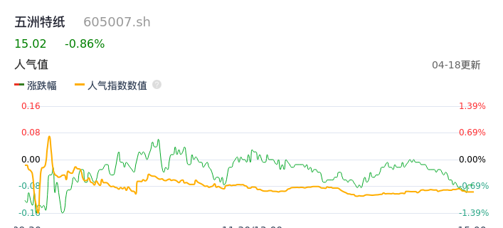 04月18日,五洲特纸收报15.02,股价涨幅-0.86%,成交金额3910.05万元,换手率0.65%。