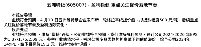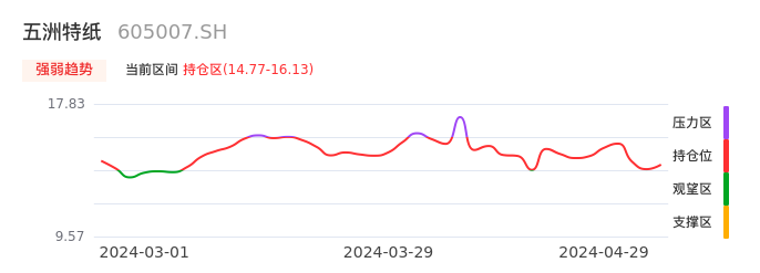 值得注意的是:2024年04月国泰君安的王佳/毛宇翔分析师,首次发布关于五洲特纸的研究报告,标题为:五洲特纸(605007):盈利稳健 重点关注提价落地节奏。