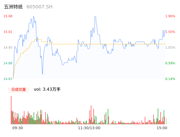 04月29日,五洲特纸收报15.00,股价涨幅1.42%,成交金额5136.07万元,换手率0.86%。