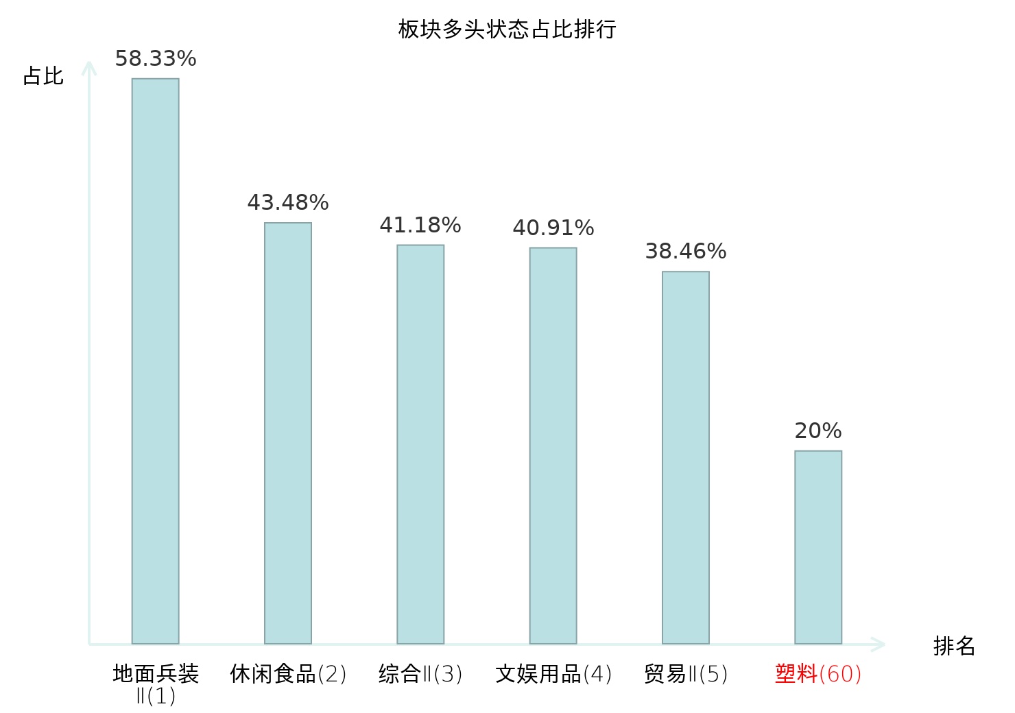 全市场所有行业板块中主力多头状态占比排名中,地面兵装Ⅱ板块位居第一。林业Ⅱ板块名次提升最快,较昨日上升90位。