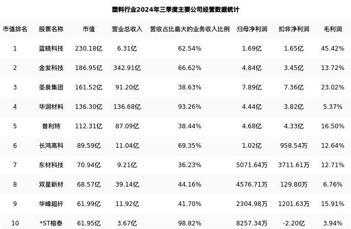 长鸿高科最新报告期数据为三季度,下表汇总了塑料行业内市值靠前的公司三季度主要经营数据