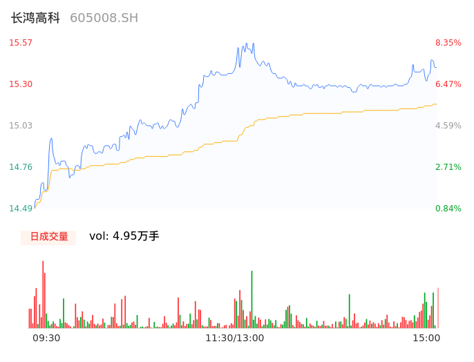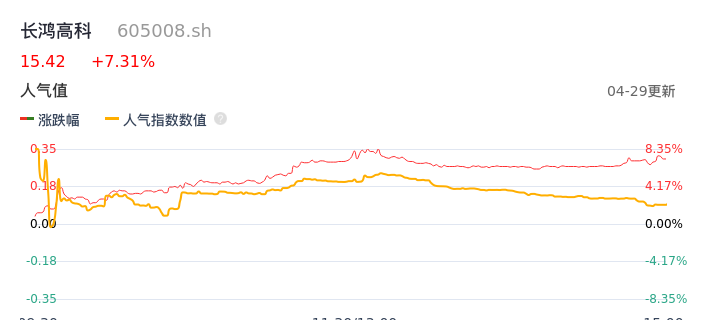 04月29日,长鸿高科收报15.42,股价涨幅7.31%,成交金额7518.09万元,换手率0.77%。