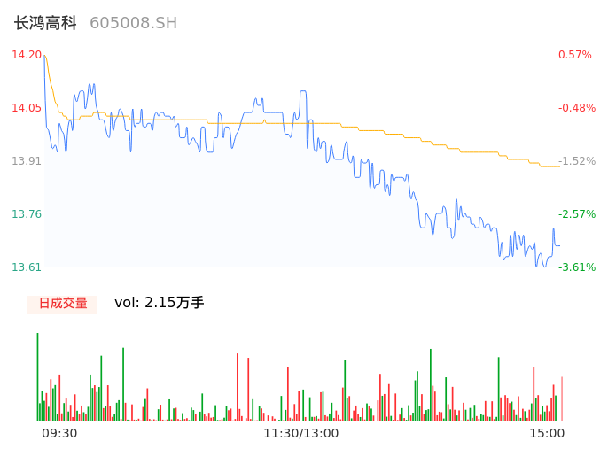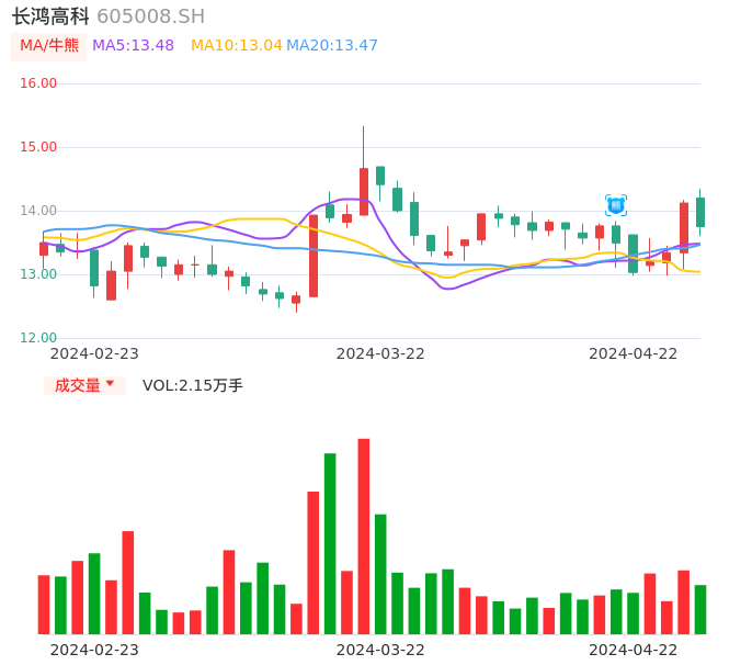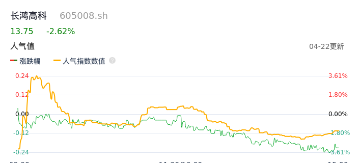 04月22日,长鸿高科收报13.75,股价涨幅-2.62%,成交金额2989.74万元,换手率0.34%。