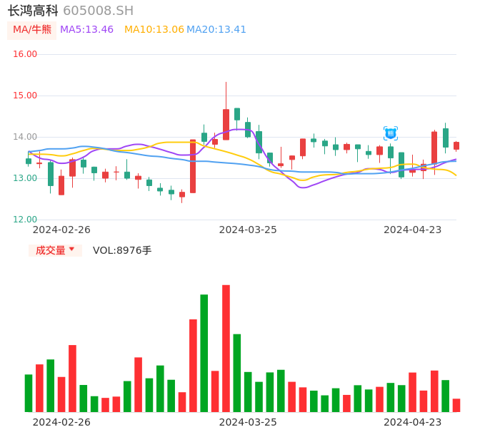 04月23日,长鸿高科收报13.87,股价涨幅0.87%,成交金额1240.04万元,换手率0.14%。