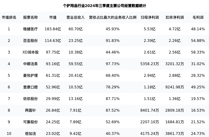 豪悦护理最新报告期数据为三季度,下表汇总了个护用品行业内市值靠前的公司三季度主要经营数据