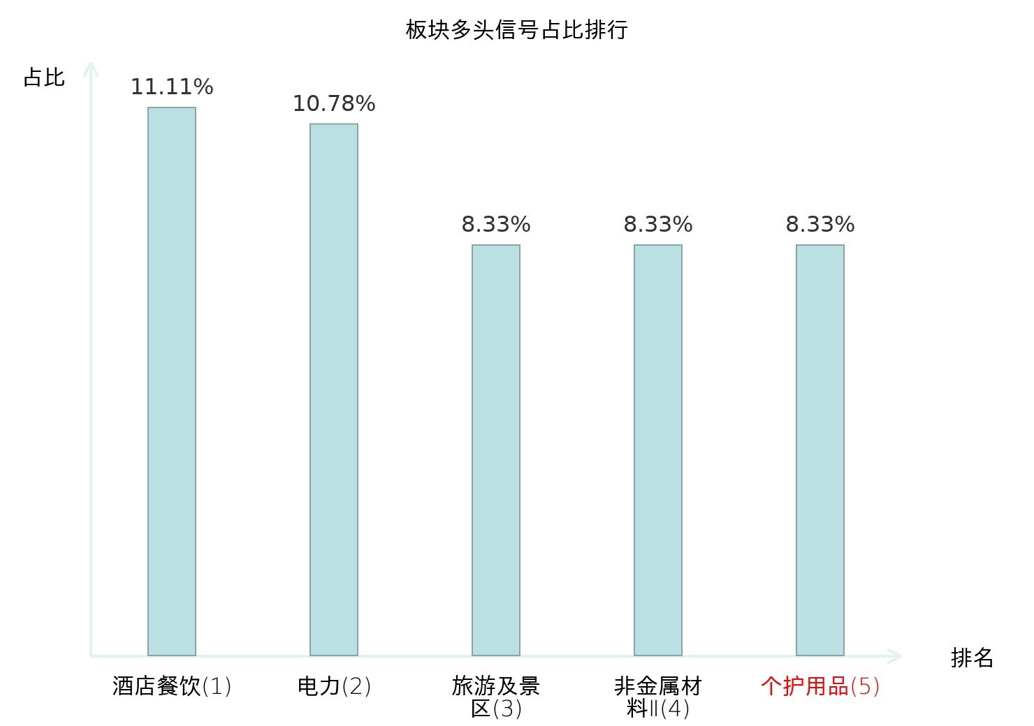 全市场所有行业板块中主力多头信号占比排名中,酒店餐饮板块位居第一。航运港口板块名次提升最快,较昨日上升87位。