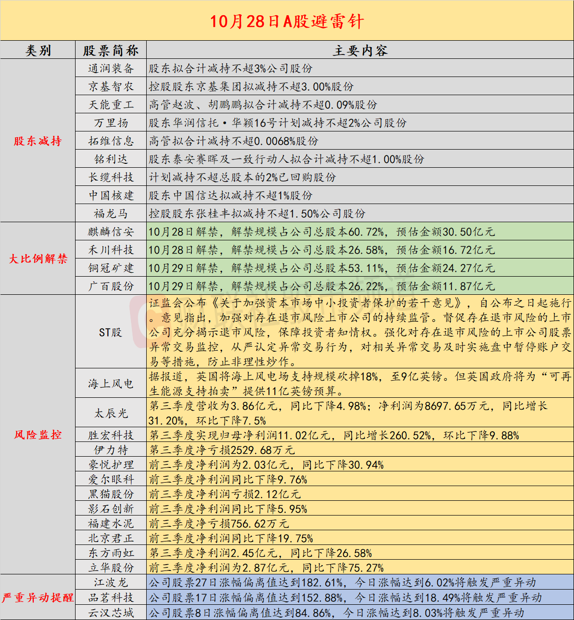 导读:财联社10月28日投资避雷针,近日,A股及海外市场潜在风险事件如下。国内经济信息方面包括:1)证监会强化对存在退市风险的上市公司股票异常交易监控,从严认定异常交易行为;2)10月27日,25年飞天茅台原箱较前一日下跌20元;公司方面重点关注包括:1)胜宏科技第三季度实现归母净利润11.02亿元,同比增长260.52%,环比下降9.88%;2)太辰光:第三季度营收为3.86亿元,同比下降4.98%;净利润为8697.65万元,同比增长31.20%,环比下降7.5%;海外市场重点关注包括:1)国际贵金属期货大幅收跌超3%;2)英国将海上风电场支持规模砍掉18%,至9亿英镑。