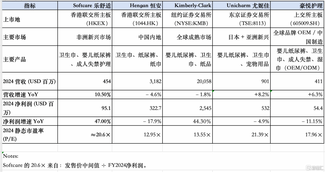 前文已提及,乐舒适的多重特质印证其为港股稀缺投资标的。纵观港A两市,更可以清楚看到,其几乎没有没有可对比标的。在现有卫生用品企业中,恒安、维达聚焦本土市场,豪悦护理聚焦OEM/ODM 代工制造业务(营收以国内市场为主),乐舒适是唯一聚焦新兴市场的标的。