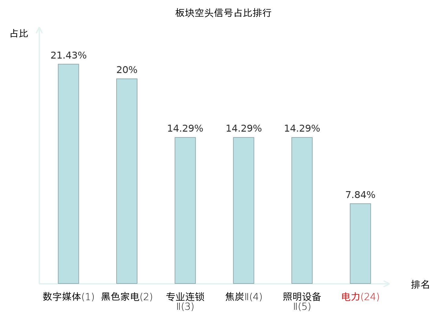 全市场所有行业板块中主力空头信号占比排名中,数字媒体板块位居第一。装修装饰Ⅱ板块名次提升最快,较昨日上升110位。