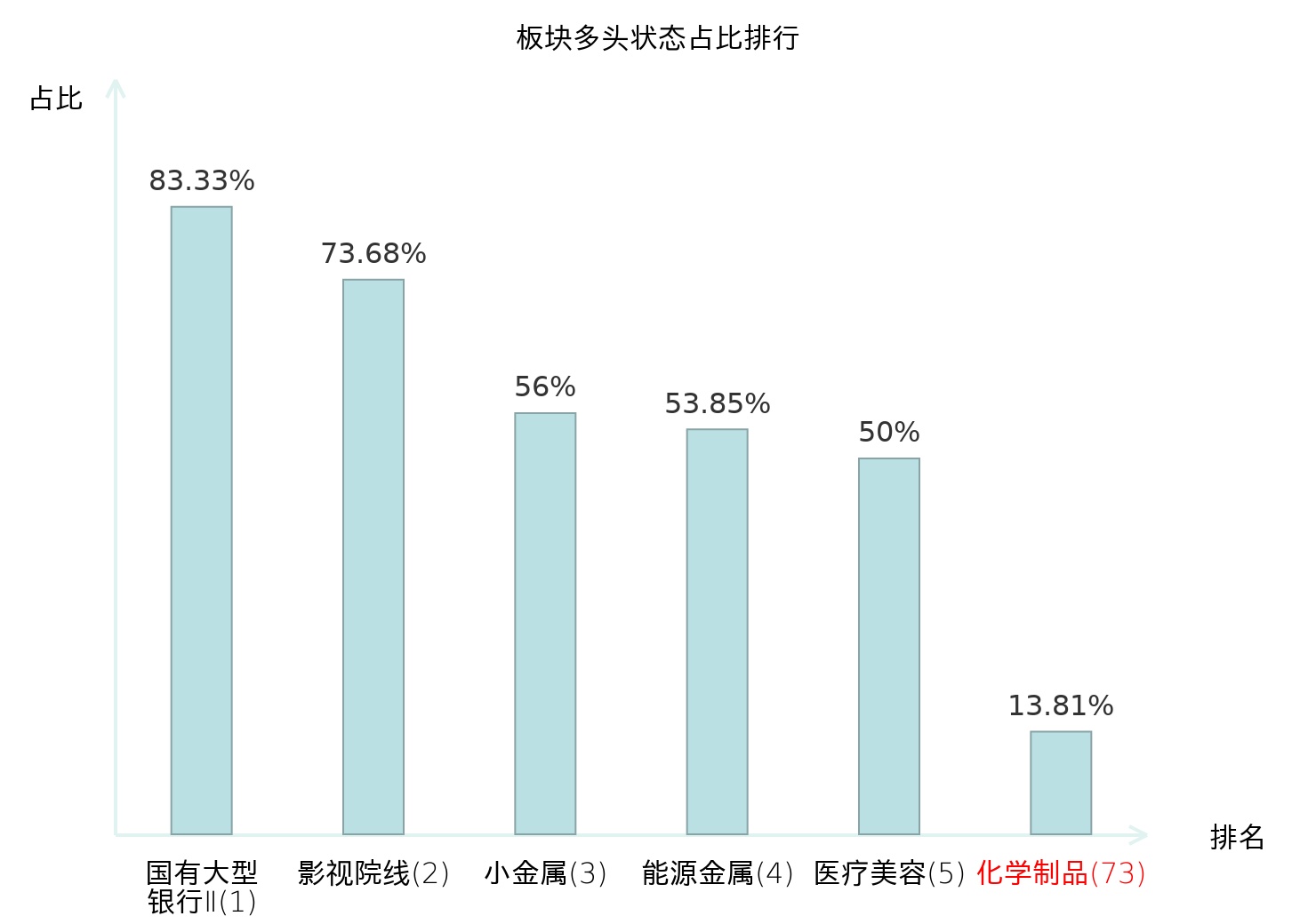 全市场所有行业板块中主力多头状态占比排名中,国有大型银行Ⅱ板块位居第一。电视广播Ⅱ板块名次提升最快,较昨日上升99位。