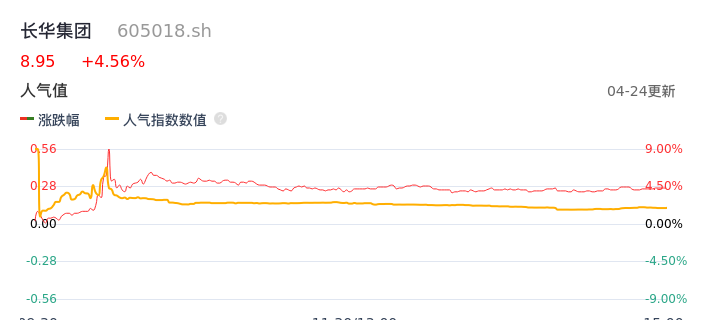 04月24日,长华集团收报8.95,股价涨幅4.56%,成交金额5648.45万元,换手率1.34%。