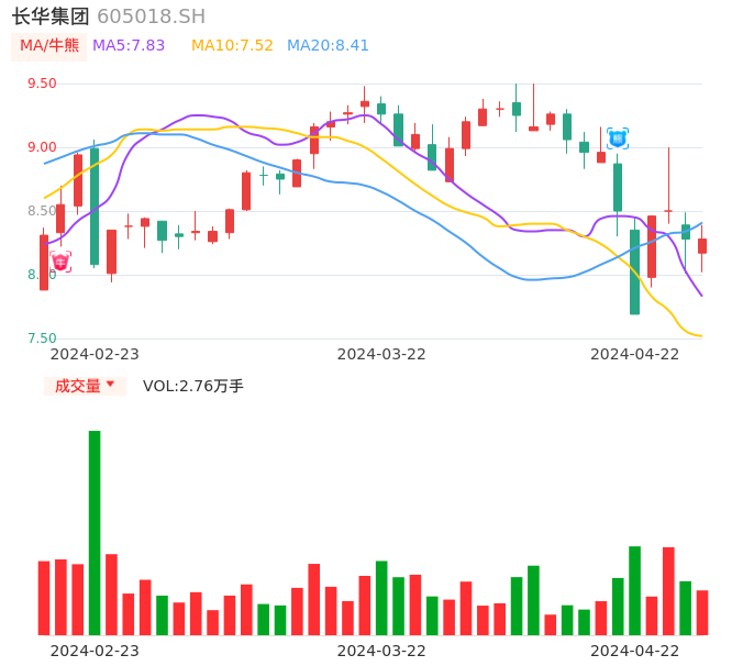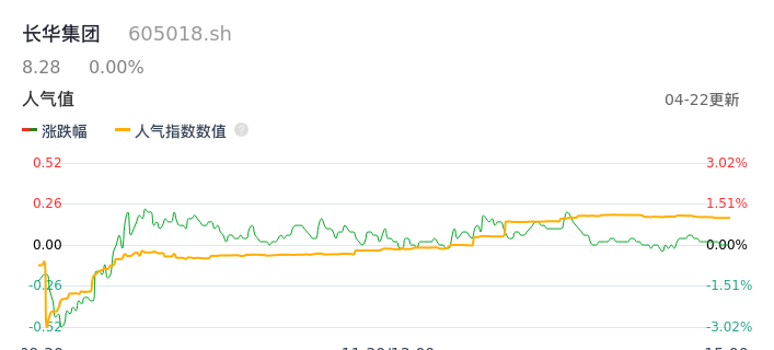 04月22日,长华集团收报8.28,股价涨幅0.00%,成交金额2284.77万元,换手率0.59%。