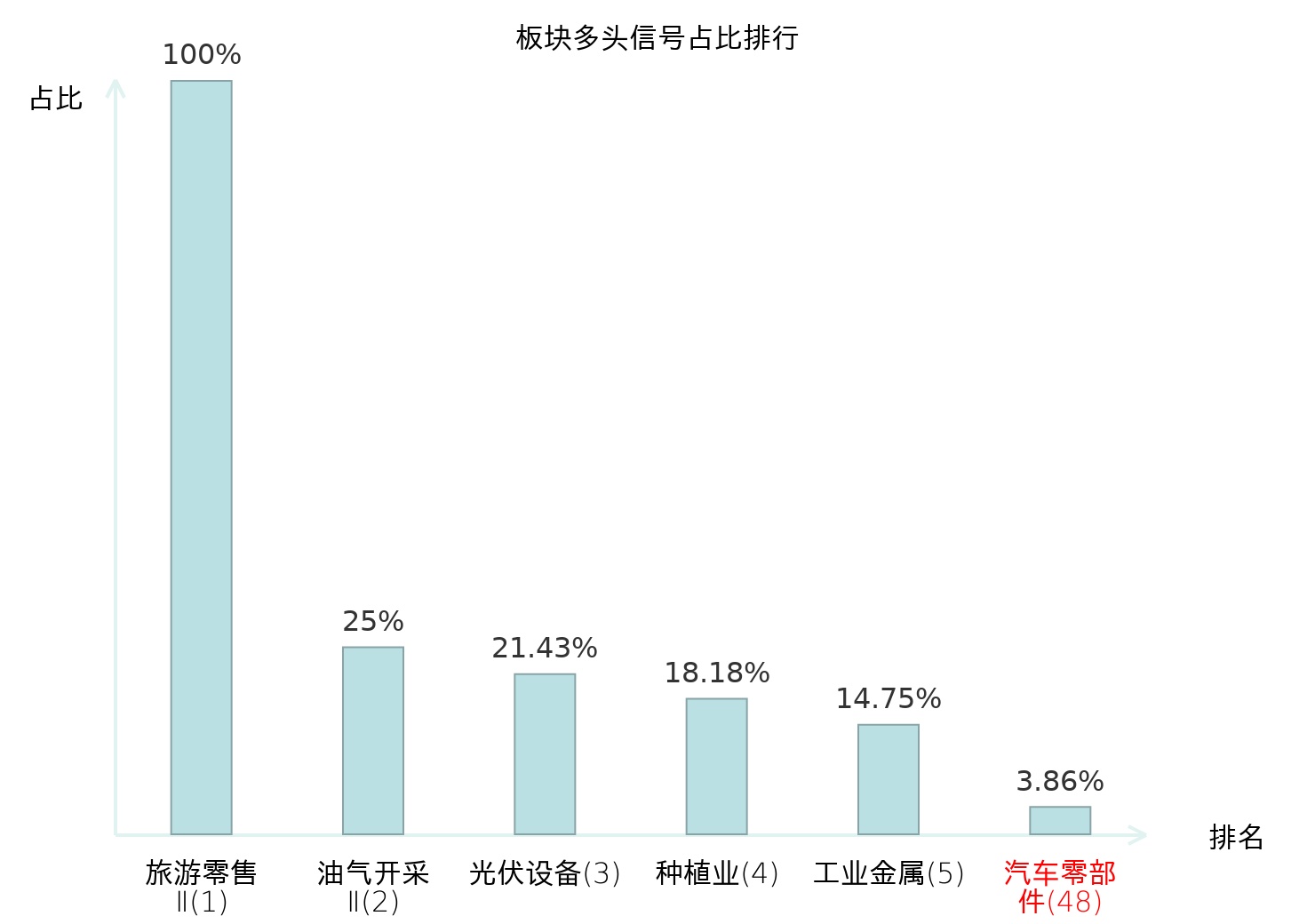 全市场所有行业板块中主力多头信号占比排名中,旅游零售Ⅱ板块位居第一。旅游零售Ⅱ板块名次提升最快,较昨日上升130位。