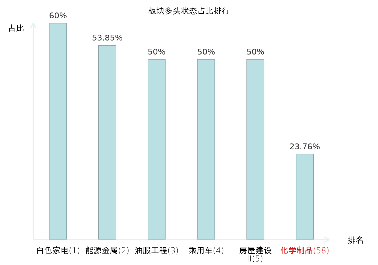 全市场所有行业板块中主力多头状态占比排名中,白色家电板块位居第一。油气开采Ⅱ板块名次提升最快,较昨日上升45位。