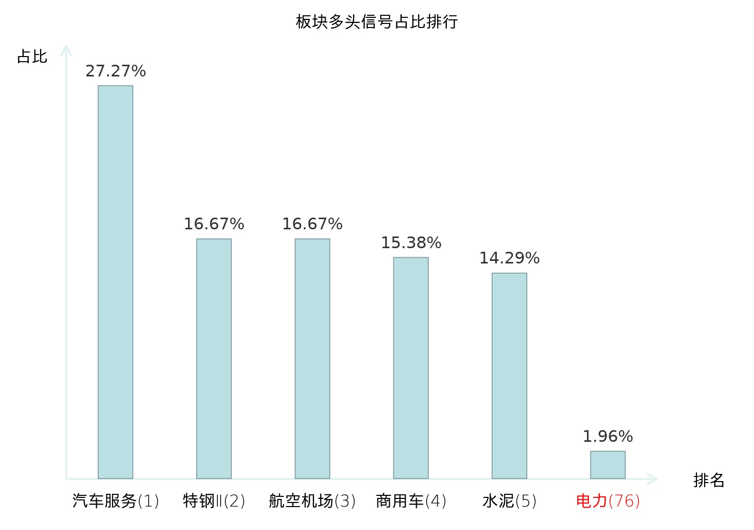 全市场所有行业板块中主力多头信号占比排名中,汽车服务板块位居第一。汽车服务板块名次提升最快,较昨日上升112位。