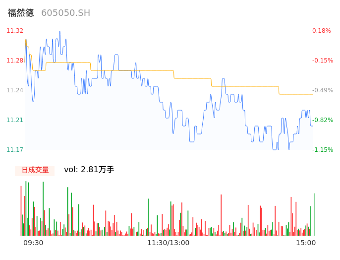 04月25日,福然德收报11.18,股价涨幅-1.06%,成交金额3154.22万元,换手率0.57%。