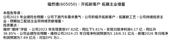 值得注意的是:2024年04月国泰君安的分析师,首次发布关于福然德的研究报告,标题为:福然德(605050):开拓新客户 拓展主业增量。