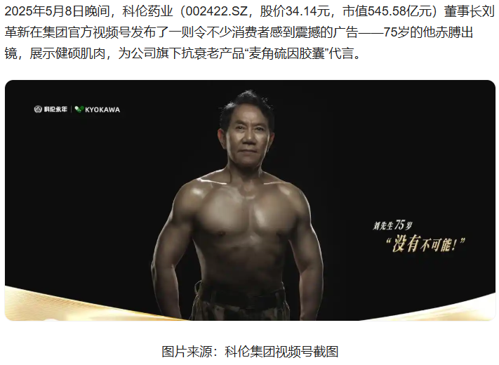 1、科伦集团发布一则关于麦角硫因胶囊的广告,在该视频中,75岁董事长刘革新赤膊上阵,多角度展示上半身肌肉,为公司抗衰老产品代言!