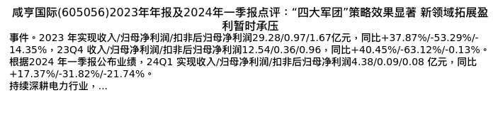 值得注意的是:2024年04月民生证券的徐皓亮分析师,首次发布关于咸亨国际的研究报告,标题为:咸亨国际(605056)2023年年报及2024年一季报点评:“四大军团”策略效果显著 新领域拓展盈利暂时承压。