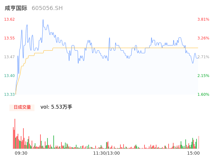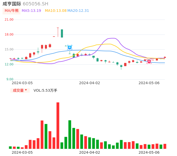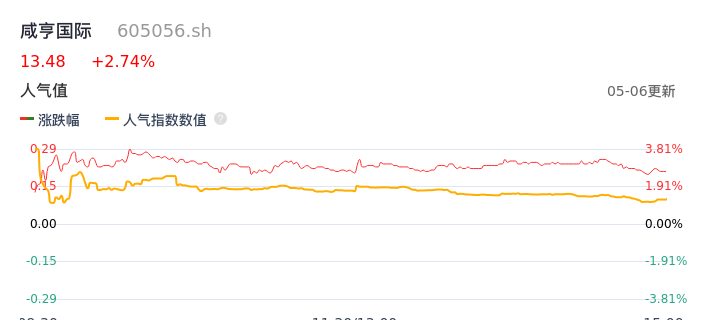 05月06日,咸亨国际收报13.48,股价涨幅2.74%,成交金额7467.57万元,换手率3.46%。