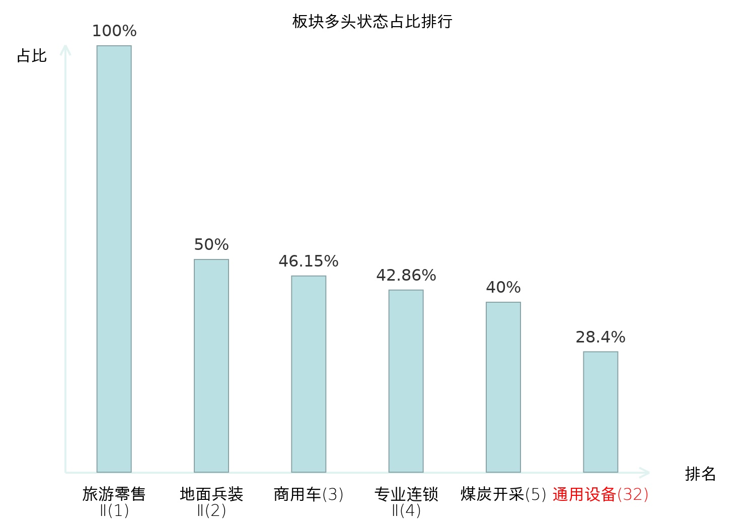 全市场所有行业板块中主力多头状态占比排名中,旅游零售Ⅱ板块位居第一。汽车服务板块名次提升最快,较昨日上升83位。