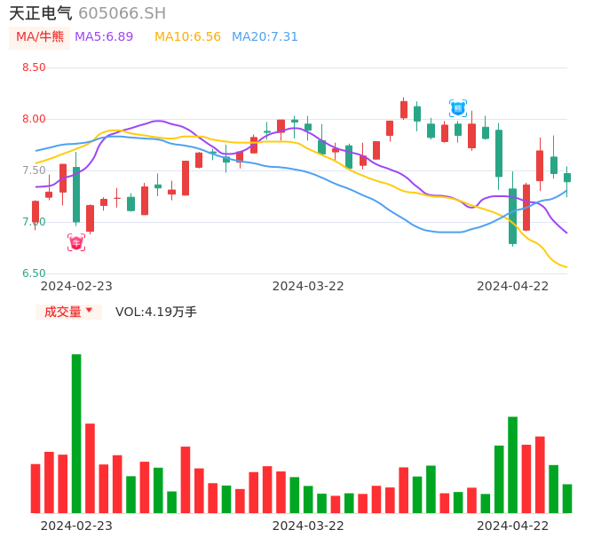 04月22日,天正电气收报7.39,股价涨幅-1.07%,成交金额3095.91万元,换手率1.04%。