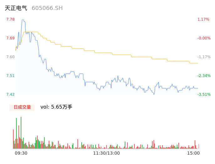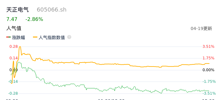 04月19日,天正电气收报7.47,股价涨幅-2.86%,成交金额4274.56万元,换手率1.41%。