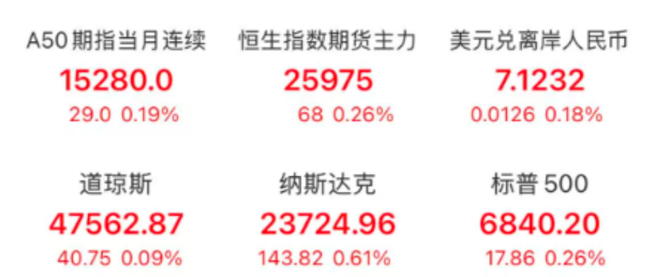 纳斯达克中国金龙指数收涨0.53%,A50期指上涨0.19%,恒生指数期货上涨0.26%。