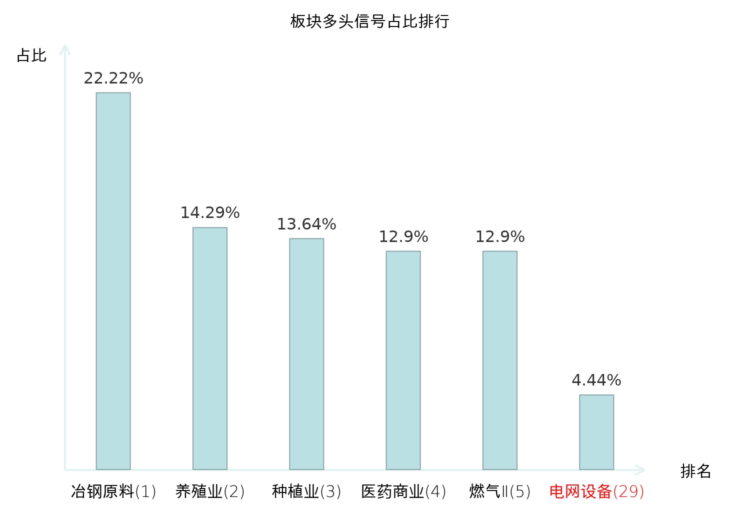 全市场所有行业板块中主力多头信号占比排名中,冶钢原料板块位居第一。航天装备Ⅱ板块名次提升最快,较昨日上升114位。
