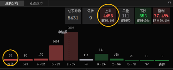 红盘个股超4400只,涨停88只,跌停13只,好几只连板高位股。个股中位数接近2%。昨天是亏钱效应满满的一天,今天则是赚钱效应满满的一天,924一周年,红盘大涨收官!