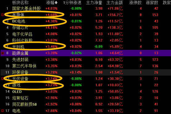 上午场子热了起来,下午还补了点量能,量化又来发力了。半导体光刻机拉完,开始拉机器人、新能源(BC电池、光伏设备)、游戏。