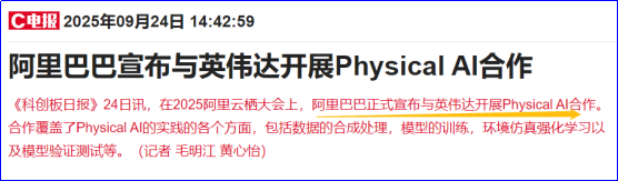 今天两大重磅会议,阿里的云栖大会算是有一些消息出来的,比如阿里和英伟达合作,开展物理AI。英伟达就曾在2025世界机器人大会,发表主题演讲并与银河通用、宇树科技、中坚科技等机器人生态合作伙伴,展示在物理AI与通用机器人领域的布局。