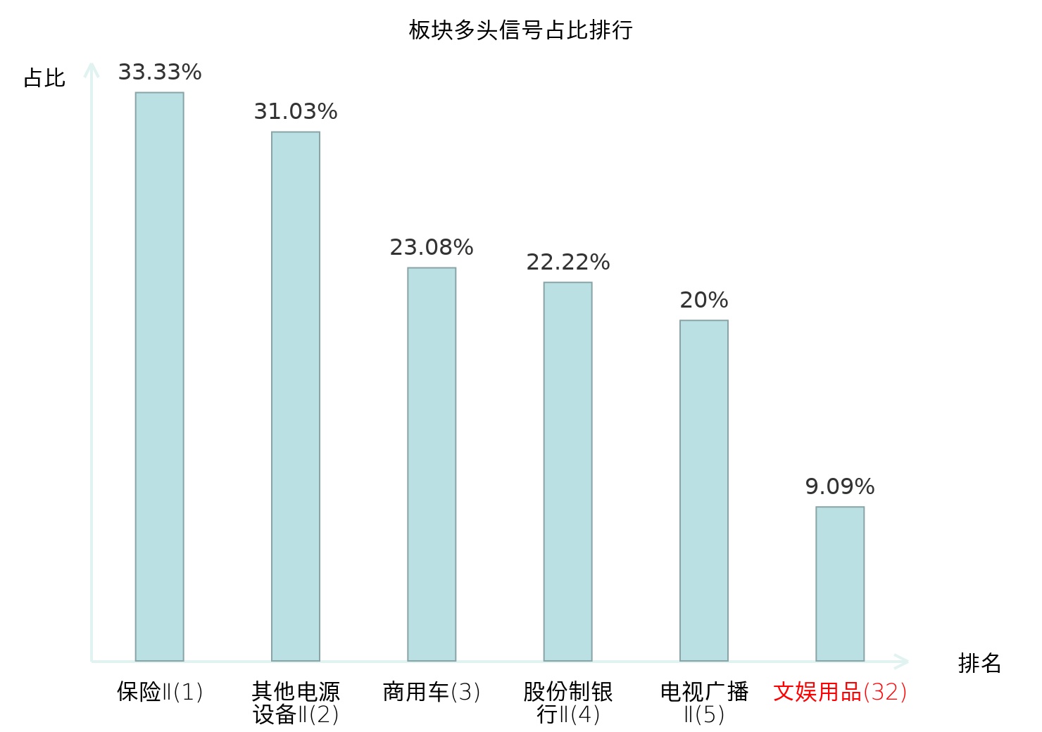 全市场所有行业板块中主力多头信号占比排名中,保险Ⅱ板块位居第一。股份制银行Ⅱ板块名次提升最快,较昨日上升119位。