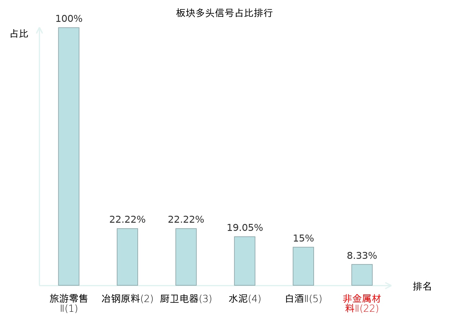 全市场所有行业板块中主力多头信号占比排名中,旅游零售Ⅱ板块位居第一。旅游零售Ⅱ板块名次提升最快,较昨日上升130位。