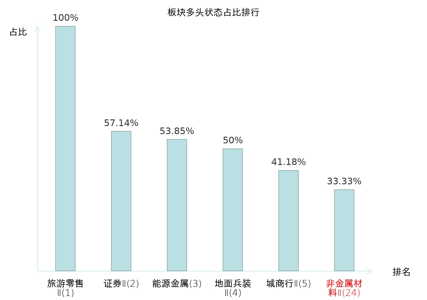 全市场所有行业板块中主力多头状态占比排名中,旅游零售Ⅱ板块位居第一。渔业板块名次提升最快,较昨日上升57位。