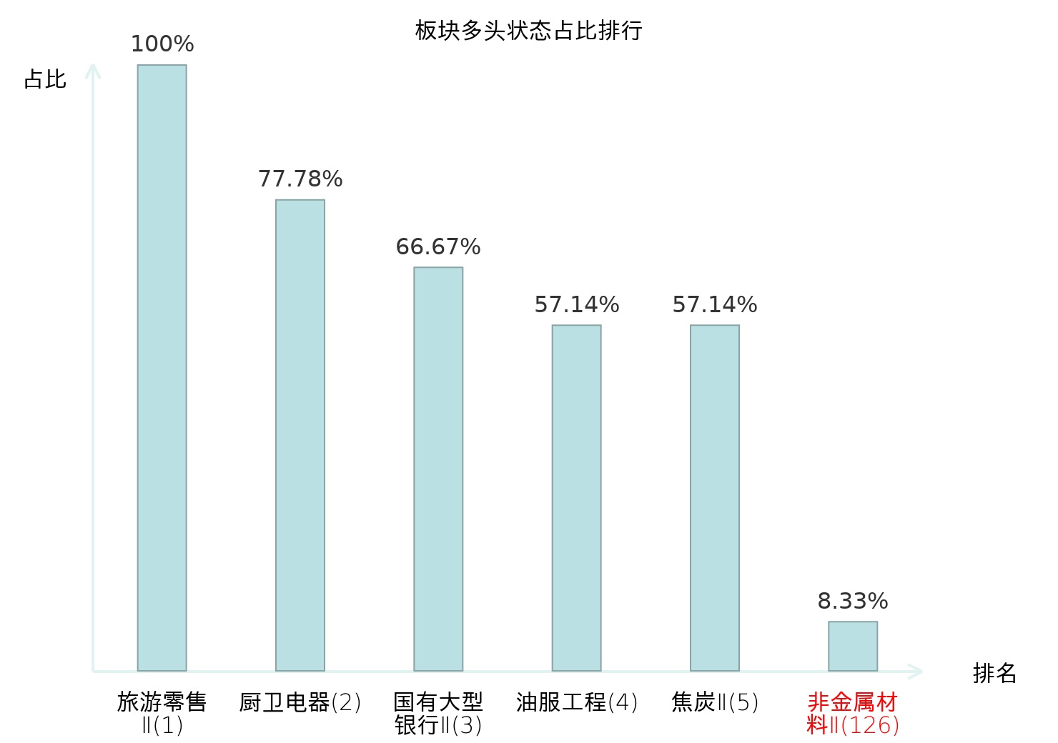 全市场所有行业板块中主力多头状态占比排名中,旅游零售Ⅱ板块位居第一。房地产服务板块名次提升最快,较昨日上升71位。