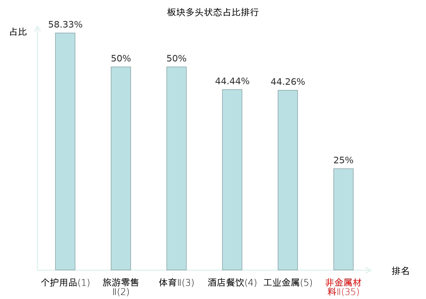 全市场所有行业板块中主力多头状态占比排名中,个护用品板块位居第一。非白酒板块名次提升最快,较昨日上升65位。