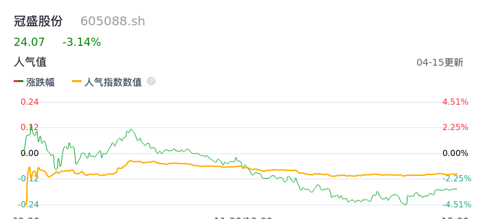 04月15日,冠盛股份收报24.07,股价涨幅-3.14%,成交金额2.73亿元,换手率6.50%。